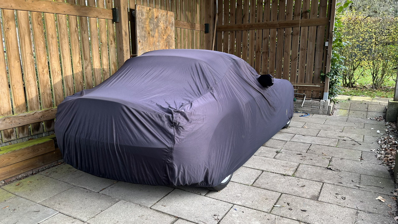 Vanochtend de hoes even over de Z4 gedaan, mooie kwaliteit hoes. Auto eerst weer helemaal met doek nagelopen want je wilt geen zand tussen hoes en lak hebben.